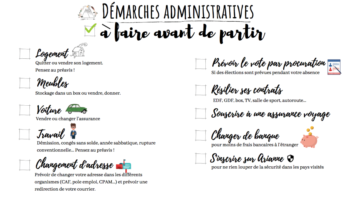 Les étapes ci-dessous dépendent principalement de la durée de votre voyage. Si vous prévoyez de partir 6 mois ou plus, il peut être utile de louer votre logement. Il peut également être nécessaire de changer votre adresse postale pour continuer à recevoir votre courrier et vos factures. Enfin, pensez à vous munir d'un permis de conduire international si vous voyagez avec votre véhicule ou si vous envisagez de louer une voiture lorsque vous serez dans votre pays de destination.
